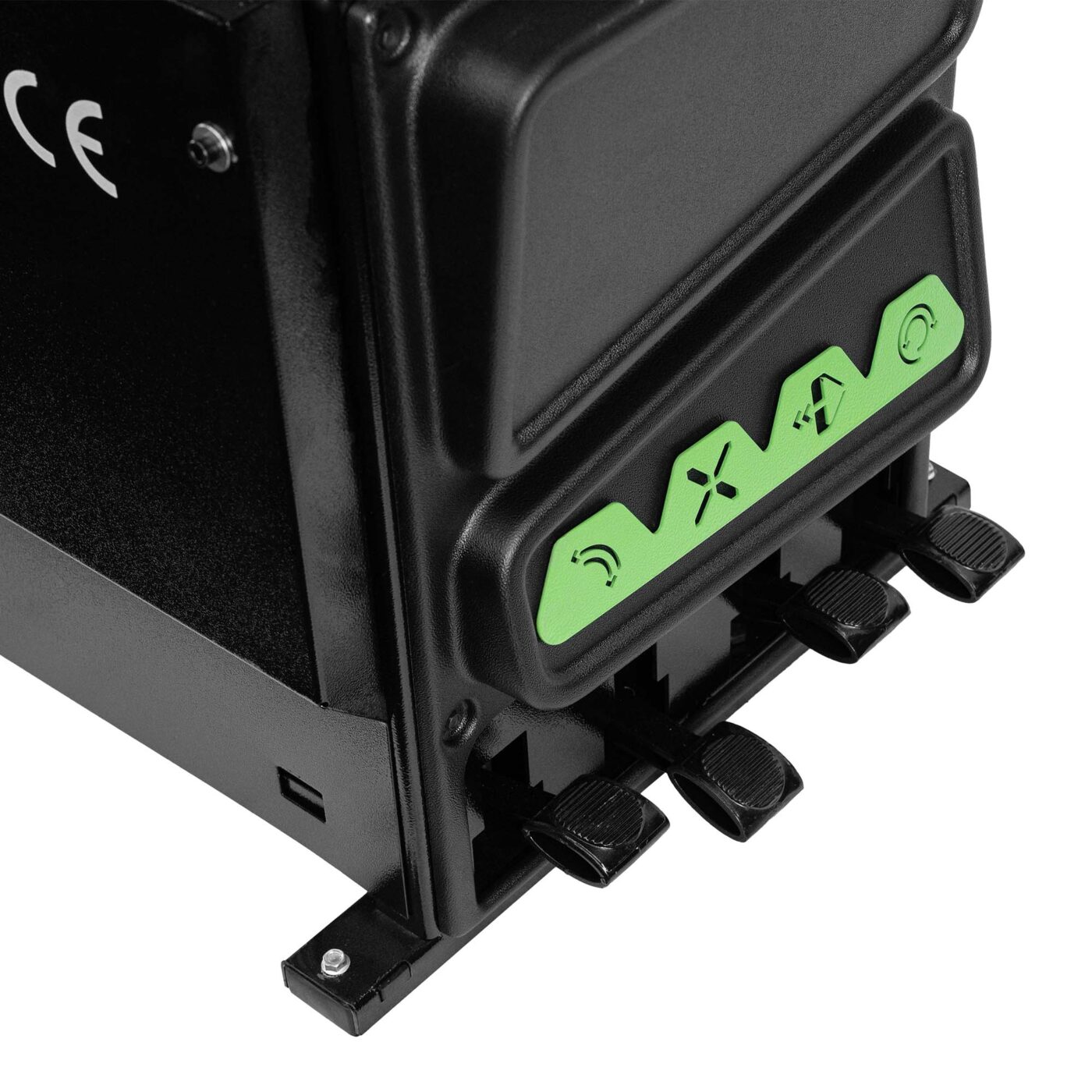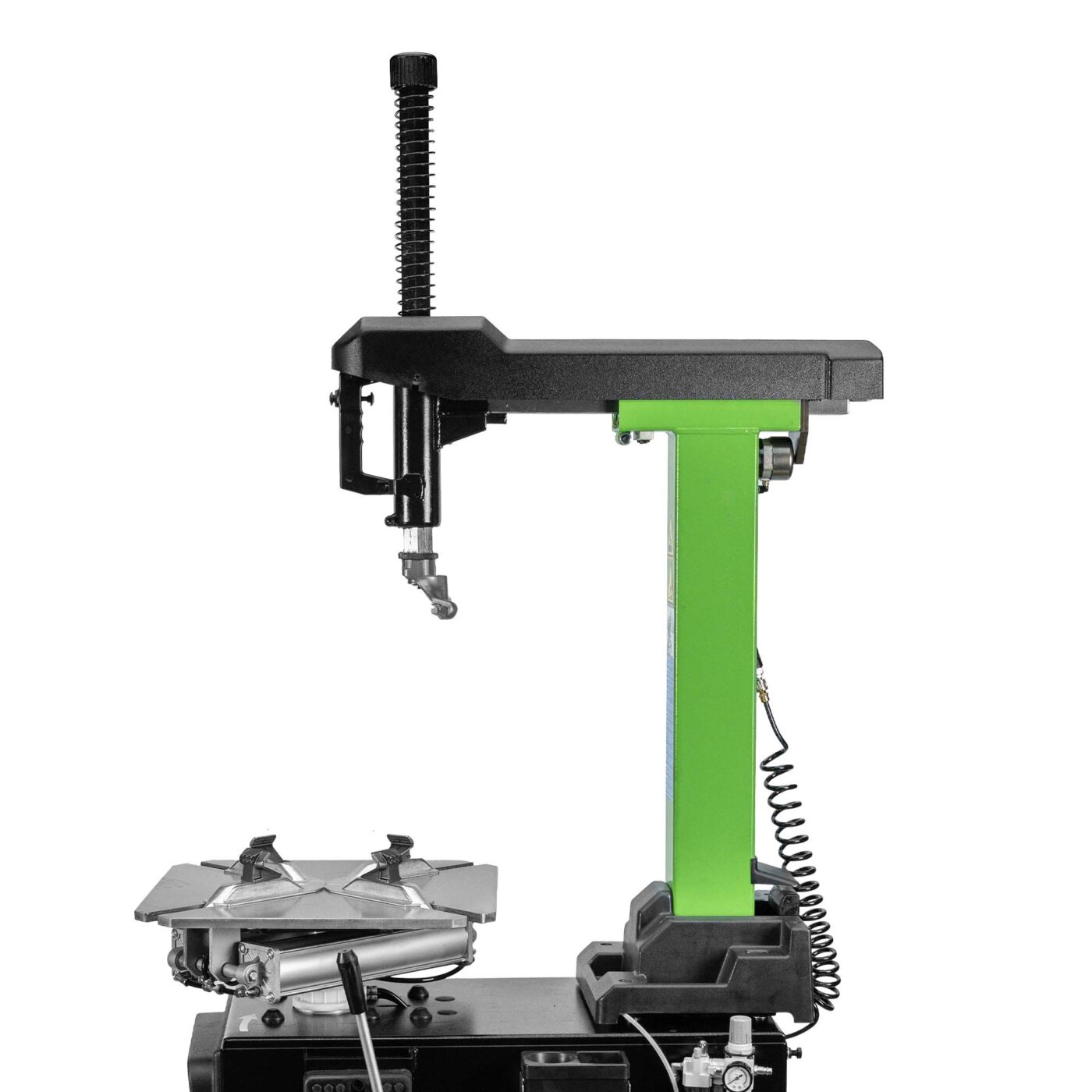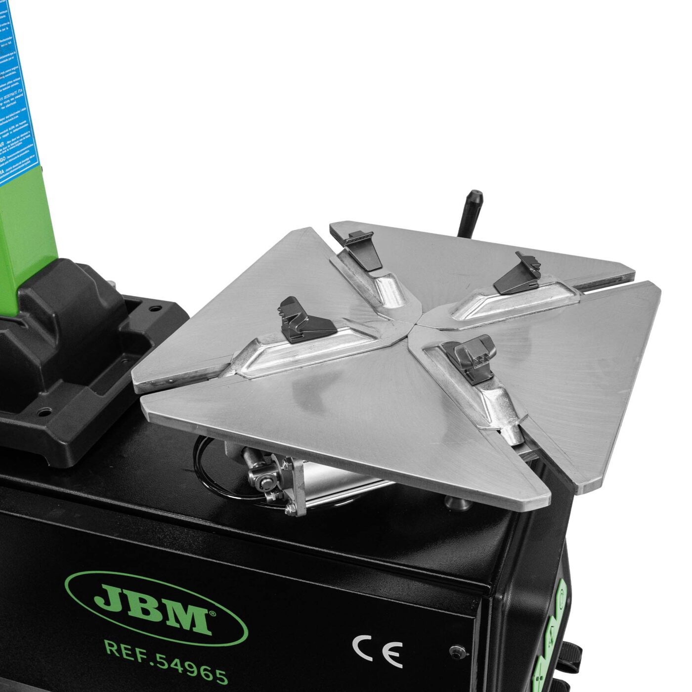 Le démonte-pneu automatique JBM REF 54965 est équipé d’une barre de pression hexagonale et d’un système de verrouillage pneumatique assurant un positionnement précis de la tête de montage.